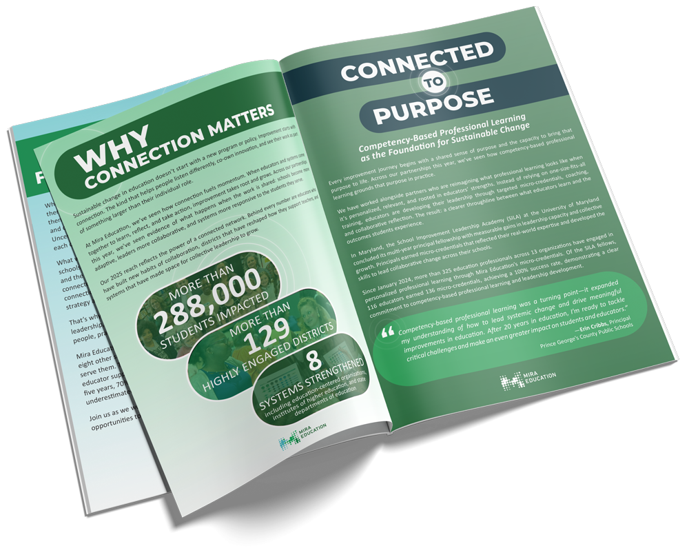 Mira Education partners with P20 organizations to help educators at every level connect to shared goals, collective expertise, and the learners they serve. Together, we design solutions, implement improvement, and sustain results that accelerate opportunities for each student.