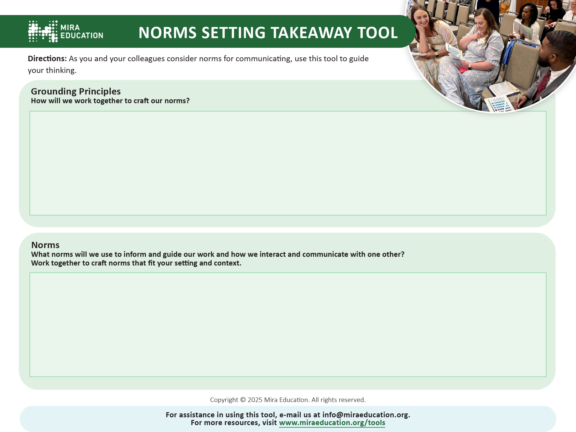 Use this tool to guide your team in creating communication norms that fit your context. Reflect on how you want to work together, define shared expectations, and ensure your interactions support collaboration and collective leadership.
